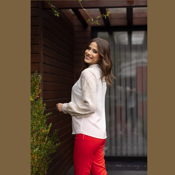 Camisola em tecido com mangas em tecido rendado, delicada e feminina, ideal para looks elegantes.